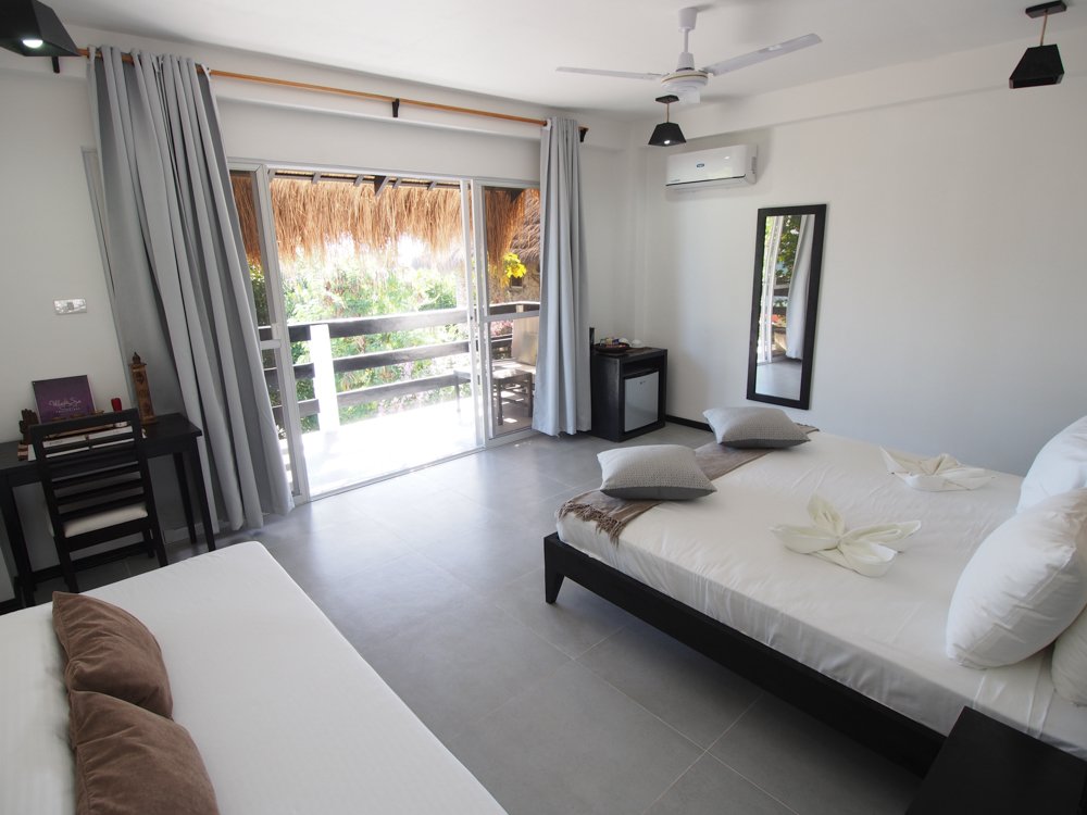 Our standard Sea View Deluxe room can accommodate 2 to 3 people with 1 Queen size bed and an additional Single bed.