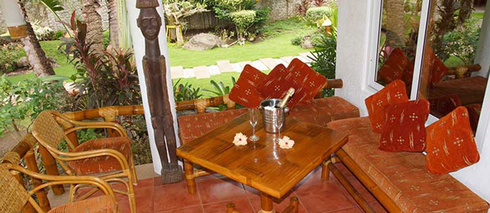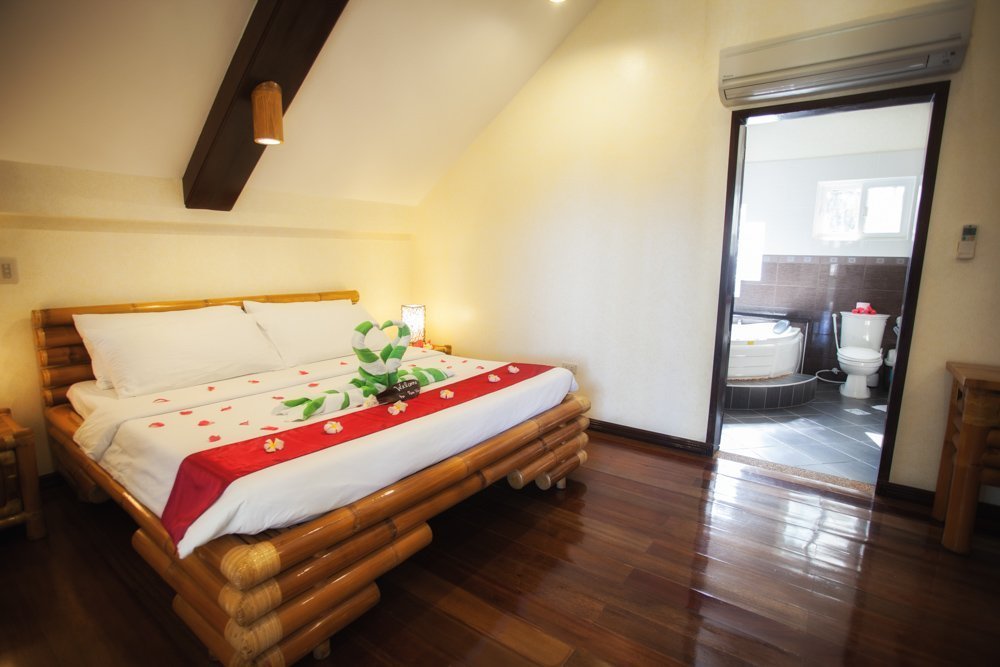 The 10 air-conditioned bamboo cottages are located at the rear portion of the resort. All rooms come with a balcony offering a nice view over the beautiful garden in the center. The two single beds can be arranged into one matrimonial bed but there are also 3 standard rooms with a king-size double bed. Furthermore, a small cable TV, minibar refrigerator, in-room safe, and a coffee and tea making facility can be found in each room.